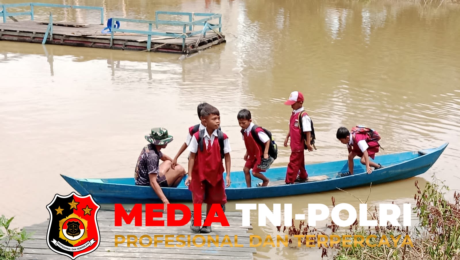 Disamping melaksanakan pembagunan jembatan Garuda Serka Herman juga menyempatkan waktu untuk membantu anak anak berangkat ataupun pulang sekolah menggunakan perahu.